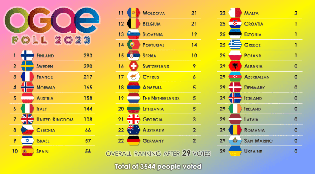 Stało się to, czego fani się spodziewali. Finlandia 🇫🇮 przegoniła Szwecję 🇸🇪 w OGAE Poll. Po pięciu nowych głosowaniach „Cha Cha Cha” ma 3-punktową przewagę nad „Tattoo”. Kluby OGAE z Niemiec 🇩🇪 (88 osób), Serbii 🇷🇸 (34 osoby) i Ukrainy 🇺🇦 (29 osób) dało 12 punktów raperowi z Helsinek. Serbowie i Ukraińcy 10 punktów przyznali Szwecji, a Niemcy Włochom. 8 punktów z Serbii zgarnęła Austria, z Ukrainy Norwegia, a z Niemiec Francja, zresztą nasi sąsiedzi dali Loreen „tylko” 7 punktów. Dodatkowo OGAE Włochy 🇮🇹 (216 osób) przydzieliło 12 punktów Francji, 10 Finlandii, a 8 Szwecji, z kolei największy klub – OGAE UK 🇬🇧 (948 osoby!) 12 punktów dał Szwecji, 10 Finlandii, a 8 Austrii. Trwa ciekawa walka o wygraną w plebiscycie i będzie to walka dwóch państw – Szwecji i Finlandii. Trzecia jest Francja, ale z ogromną stratą punktową. W top5 utrzymują się także Norwegia i Austria, a szóste są Włochy. Tylko te kraje mają jeszcze szansę na wygraną. OGAE Ukraina 5 punktów przydzieliło Litwie i są to pierwsze głosy dla tego kraju. OGAE UK opublikowało pełne wyniki głosowania. Loreen zgarnęła 6584 głosy, a Finlandia 6026. Belgia, która zajęła 10. miejsce, miała ich już tylko 1591. Pierwsza pod kreską była Hiszpania (1417), a Blanka zajęła 26. miejsce (651) pomiędzy Islandią a Chorwacją. Ostatnie miejsce przydzielono Rumunii (84). W OGAE Serbia Finlandia wygrała z 244 punktami, Szwecja miała ich 212. Dziesiąta Armenia już tylko 63, a jeden mniej Cypr. „Solo” zajęło 17. miejsce z 36 punktami, pomiędzy Danią a Izraelem. Ostatnia Rumunia z 6 punktami.