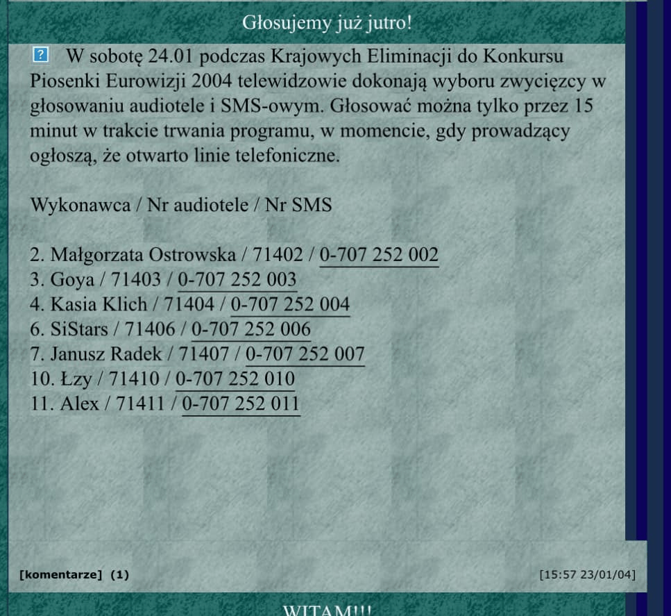 23 stycznia 2004 Polska nie była jeszcze w Unii Europejskiej, Facebook oficjalnie powstał dopiero 2 tygodnie później, nie było też YouTube, Wikipedii, a dopiero w 2004 można było mówić w kraju o powszechnej dostępności usługi internetowej – pojawiły się pakiety z łączem o prędkości 128 kb/s za 59 zł miesięcznie. Na listach przebojów królował utwór „Hey Ya” grupy Outkast, a telewizja ukraińska ogłosiła, że drugą reprezentantką tego kraju na Eurowizji będzie Ruslana. Telewizja Polska przygotowywała się do Krajowych Eliminacji, których finał zaplanowano dwa dni później. Od jakiegoś czasu w mediach i prasie kolorowej głośno było o walce fanklubów zespołów Blue Cafe i Łzy – to te grupy były faworytami selekcji. 23 stycznia 2004 dość spontanicznie powstał blog na nieistniejącym już portalu Tenbit.pl – blog poświęcony był Eurowizji. Dwa dni później pojawiły się tam informacje o wygranej piosenki „Love Song”, a setna notka przypadła na moment zwycięstwa „Wild Dances” w Stambule. Tak powstała strona, która teraz jest Dziennikiem Eurowizyjnym. 20 lat minęło bardzo szybko.