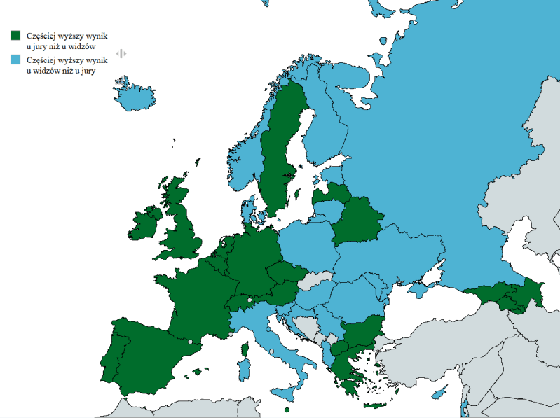 Warto zwrócić uwagę, że o ile w top5 różnic jury/widzowie tylko w trzech przypadkach wynik wynosi 200 lub więcej punktów, tak w przypadku widzowie/jury takich przypadków mamy więcej, bo poza top5, ale wciąż z różnicą ponad 200 punktów są też Polska 2016 (215 pkt), Mołdawia 2022 (225 pkt) i Finlandia 2023 (226 pkt).